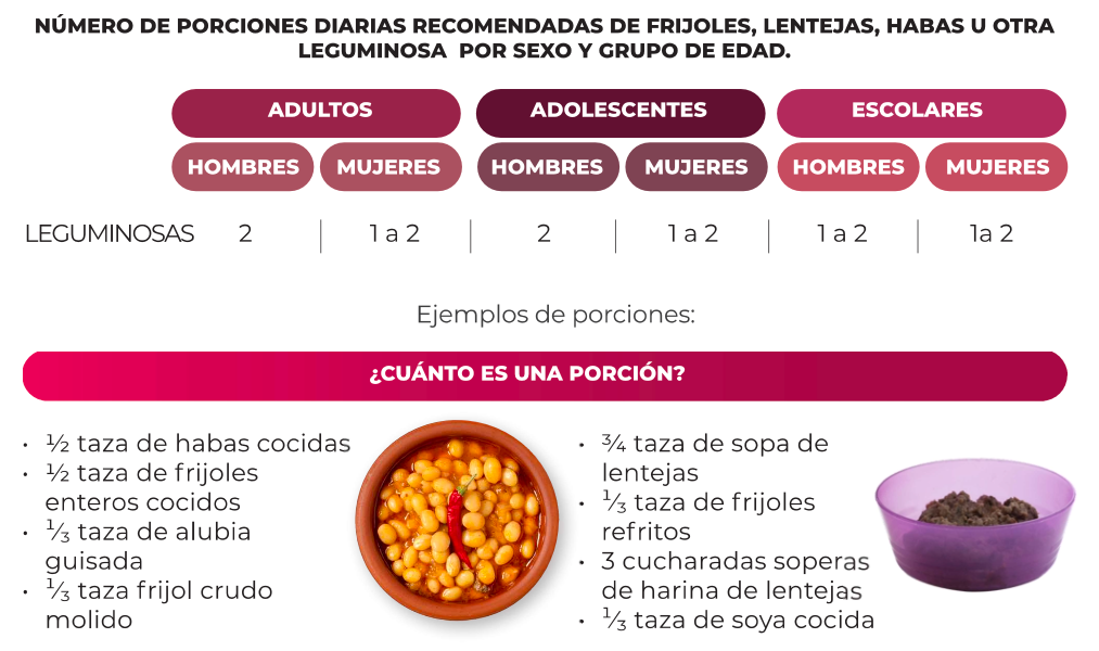 Las leguminosas se reconocen por sus flores en forma de mariposa, que luego se convierten en vainas llenas de semillas. Ejemplos de ellas son los frijoles, garbanzos, lentejas y habas, que destacan por tener mucha proteína y fibra. Por otro lado, los cereales como el arroz, el trigo y el maíz provienen de plantas que parecen pastos y tienen espigas, en la mayoría de los casos. Estos nos dan la energía necesaria para todo el día gracias a su almidón o hidratos de carbono. Si se junta ambos en un mismo plato, como arroz con lentejas o frijoles con maíz, se aprovecha mejor sus beneficios y se logra una comida más completa. Presentamos abajo el número de porciones diarias de leguminosas y cereales sugeridas en función de la edad y el sexo: