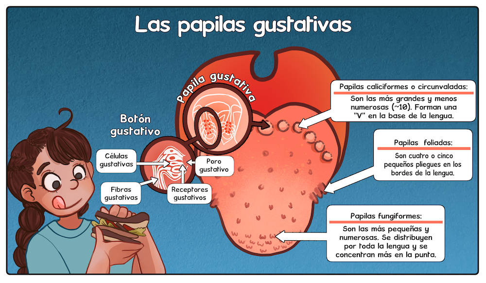 ¿Te has preguntado cómo percibimos los sabores de los alimentos? La respuesta se encuentra en nuestras papilas gustativas: esos pequeños puntos que recubren la lengua y contienen sensores llamados botones gustativos. Cuando comemos, estos captan las moléculas de la comida y envían información al cerebro para reconocer los cinco sabores principales: dulce, salado, ácido, amargo y umami (el sabor “sabroso” presente en quesos maduros, carnes curadas y el tomate, por ejemplo). Pero la boca también se comunica con la nariz. Al ingerir un alimento, se liberan aromas que suben por la parte posterior de la garganta hasta las fosas nasales. Por eso, nuestro olfato juega un papel determinante para completar la experiencia de lo que saboreamos. Adicionalmente, ciertas moléculas activan nuestro sistema trigeminal: un nervio que se divide en tres ramas conectadas con la boca, la nariz y los ojos. Este sistema es el que nos permite detectar el picante del chile, el burbujeo de una soda o el frío de una nieve.